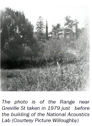 During the First World War, the Department of Defence decided to build a rifle range at Chatswood West to train recruits in marksmanship before they left for overseas to join the AIF in France. At that time Chatswood West was sparsely populated and the area selected for the range was the valley between Millwood Avenue and Greville Street.